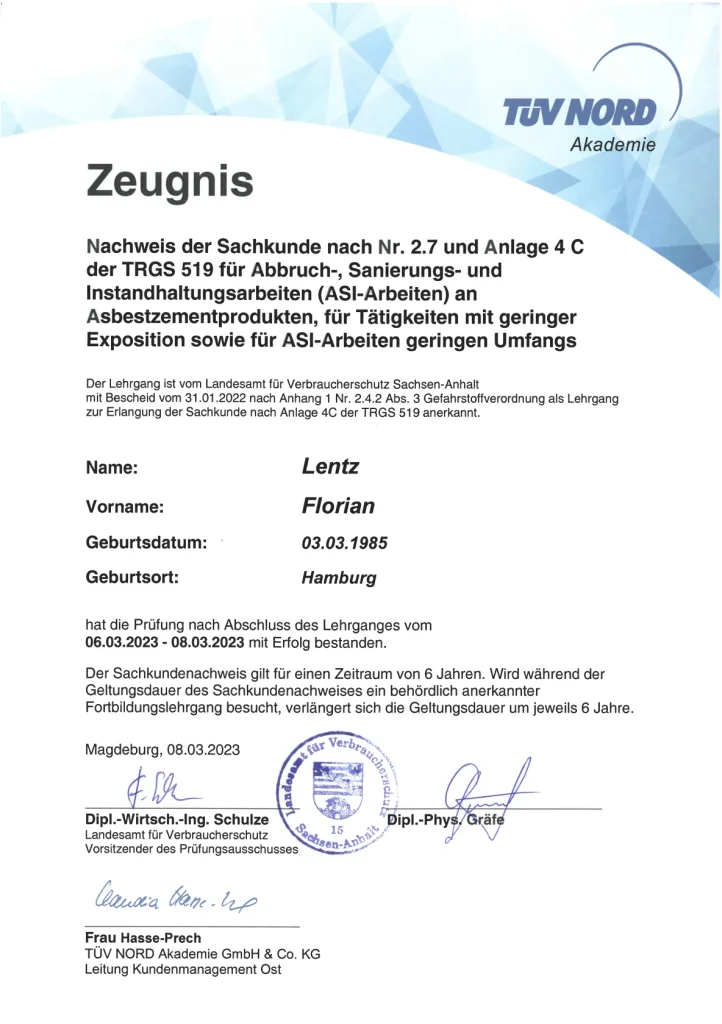 Alle Arbeiten erfolgen auf Basis einer Gefährdungsbeurteilung und eines Sanierungsplans – zuverlässig und dokumentiert.